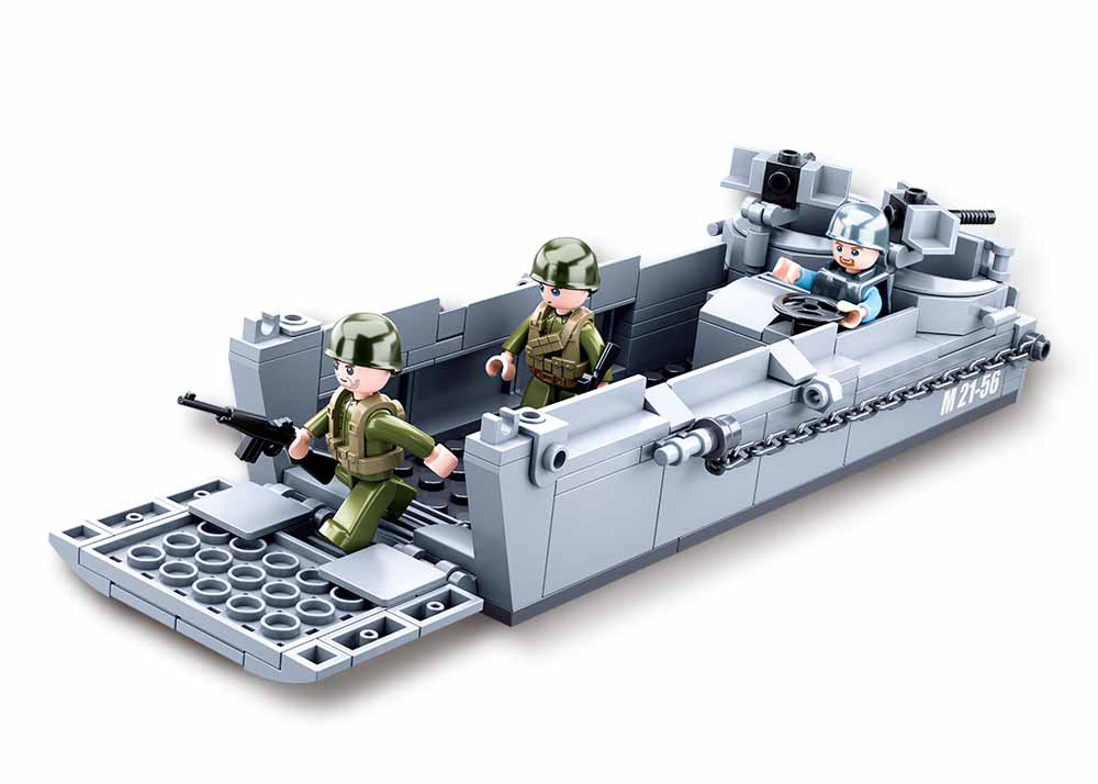 The landing craft, vehicle, personnel or Higgins boat was a landing craft used extensively in amphibious landings in World War II. Typically constructed from plywood, this shallow-draft, barge-like boat could ferry a roughly platoon-sized complement of 36 men to shore at 9 knots.