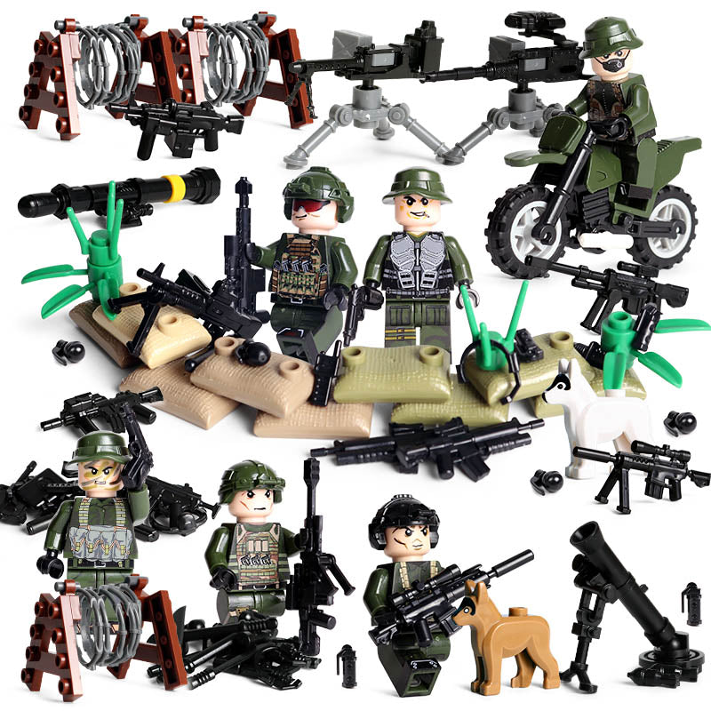 Modern Military Set - 6 Figures, Motorcycle, Razor Wire, Mortar Cannon, Guns, Weapons, Knives, Tools, and More!